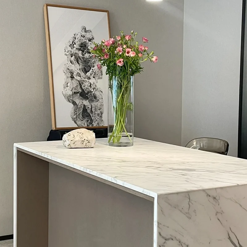 Для противоположного, используйте стойкие мраморные столешницы с темными или нейтральными шкафами. Граница водопада на вашей кухне белого мраморного острова подчеркнет Veining. Обычные размеры на острове: 2400 x 1200 мм или на заказ.